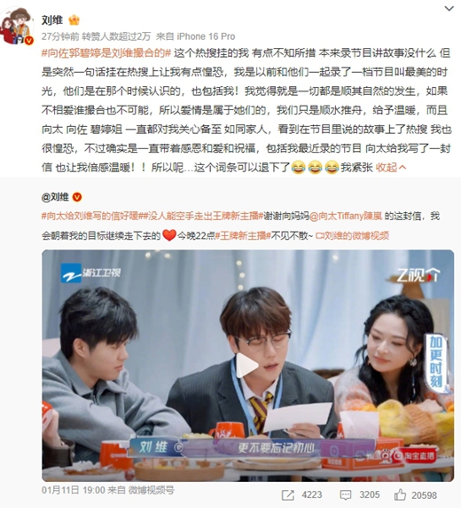 面对突如其来的热搜,刘维显得有些手足无措。1月17日,他在社交媒体上发文,表达了自己的复杂心情:“这个热搜挂的我有点不知所措。本来录节目讲故事没什么,但是突然一句话挂在热搜上让我有点惶恐。”刘维强调,他们的相遇相识一切都是顺其自然,真正的爱情是两个人之间的事,外人的“撮合”只是顺水推舟,给予温暖而已。他还感激地提到,向太、向佐和郭碧婷一直对他关心备至,如同家人一般,这让他倍感温暖。